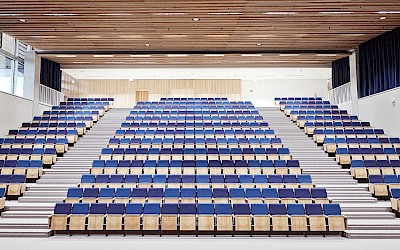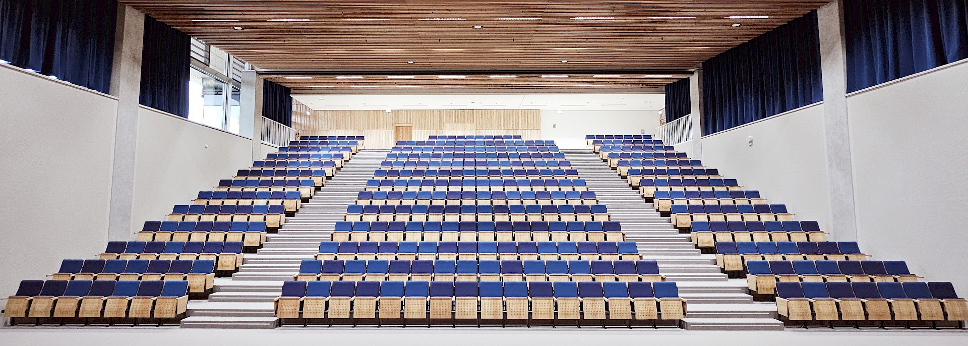 Die großzügige Aula durfte goracon systemtechnik gmbh im laufenden Schulbetrieb mit dem ansteigenden Bodensystem PODIUM im Bereich der ansteigenden Tribüne und der flachen Vortragsbühne ausstatten. Zum Auftragsumfang gehörten ebenso die anspruchsvollen Parkettarbeiten im Bühnenbereich, eine hochwertige gepolsterte Festbestuhlung, als auch die modernen Fassaden- und Kulissenvorhänge.